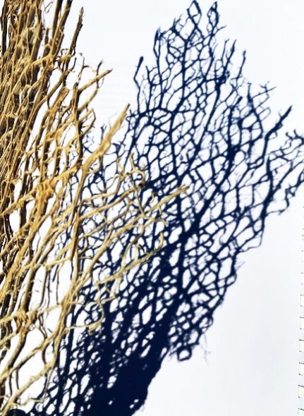 Zwei fein ziselierte „Bindegewebe“ vom Feigenkaktus brachte ich gestern vom Strand nach Haus. Heute hielt ich sie bei strahlendem Mittagslicht über ein Dossier, um ihre Schatten zu fotografieren, die sich tiefblau darstellten.