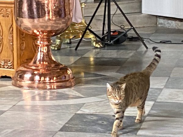 Die Feier fand in einer alten Kirche der Plaka statt: Panagia Hrissokastriotissa heißt sie, gebaut wurde sie im 12. Jahrhundert, auf den Fundamenten – wie könnte es anders sein – eines antiken Tempels, der Hestia, der Göttin des Herdfeuers gewidmet war. Den Täufling und seine glücklichen Eltern, Großeltern, Tanten, Onkel, Paten, Gratulanten möchte ich hier nicht abkonterfeien Der Kater, der den noch leeren Kirchenraum und das goldene Taufbecken inspizierte, möge sie stellvertreten.