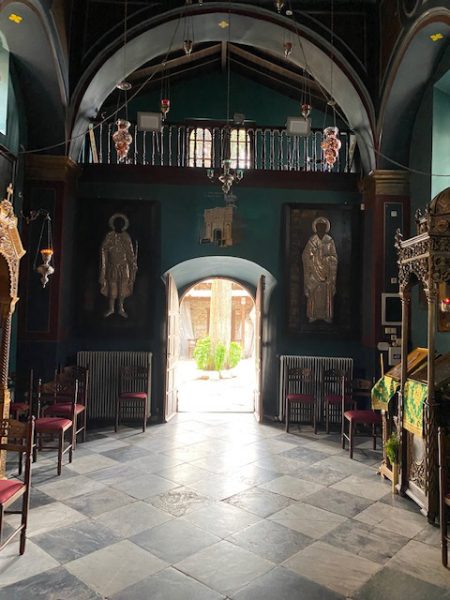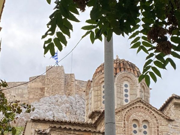 Schaut man nach oben, um auch die Kuppeln der Kirche zu betrachten, hat man prompt ein Stück Akropolis mit im Blick. Und das liebe ich so an Athen: dass die Geschichte so tief verwurzelt ist und auch im Alltagsleben niemals ganz in Vergessenheit gerät.
