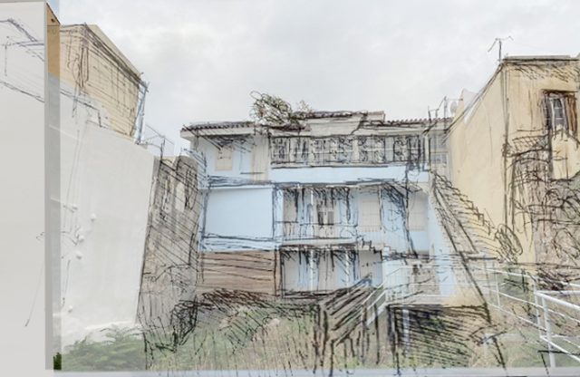Blaues Haus in der Plaka – mit Zeichnung überblendetes Foto