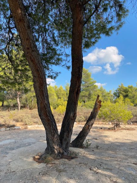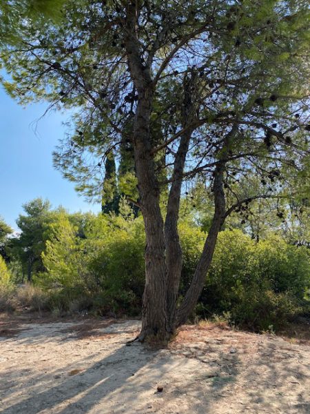 Am Rande des Kreises gibt es noch eine Gruupe von drei Pinien. Sie wirken eingebetteter. Die Zypressen im Hintergrund hätte ich gerne isoliert, aber man kann sich den Sitzplatz – in diesem Fall in umgefallener Stamm – nicht aussuchen.