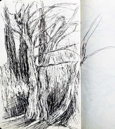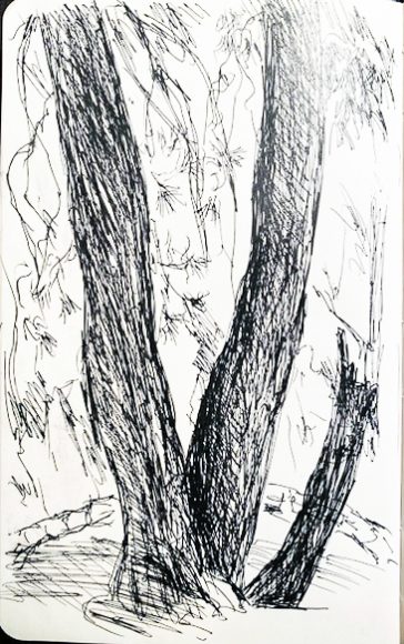 Jedenfalls zeichnete ich diese beiden Motive, und wie immer, wenn ich draußen zeichne, tut mir hinterher der Rücken weh, aber ich bin zufrieden, denn ich habe mich mit einem Stück Natur tiefer verbunden. Ich habe der Bewegung der Stämme und dem Schuppigen der Rinde und dem verstümmelten Stamm nachgespürt, bin den geschwungenen Linien der feinen Zeige, an denen die Nadeln büschelweise sitzen, gefolgt, habe Licht und Schatten wahrgenommen.