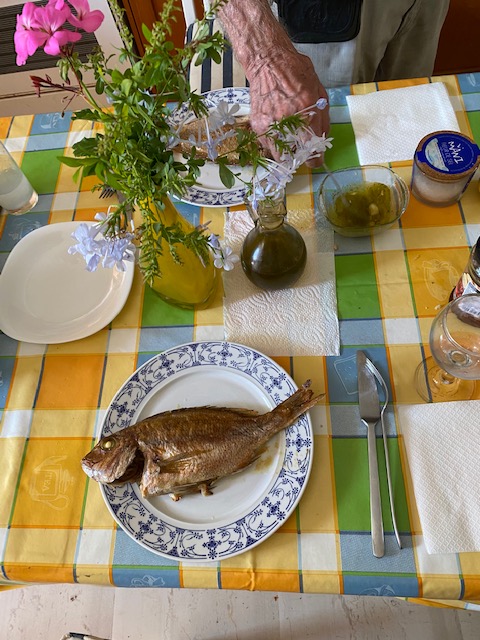 Das zweite ist ein Beweisfotos dafür, dass ich keine „Verweigerin“ bin (Bezug:deine Kommentare bei mir, unter „Zeichnen im Cafe neben dem Steueramt“). Den Fisch habe ich inzwischen verspeist. Er war ausgezeichnet zubereitet, wohlschmeckend und nahrhaft. So wünsche ich mir alles, was ich zu mir nehme. Ich verweigere nur, was ich als für mich schädlich erachte. Und ich finde, da sollte mir niemand reinreden. Und schon gar nicht der Staat, der mich überhaupt nicht kennt.