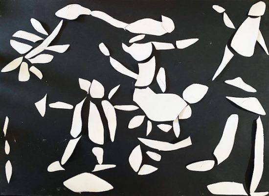Wir beginnen auf D’s Wunsch hin mit dem Bilderlegen: Abwechselnd legen wir Maries Schnipsel – die weiße Seite nach oben. Na, was ist das? „großer Hausschuh, Schlange, Fisch“. Hihi, haha, hoho.