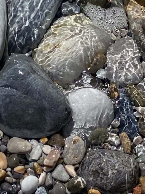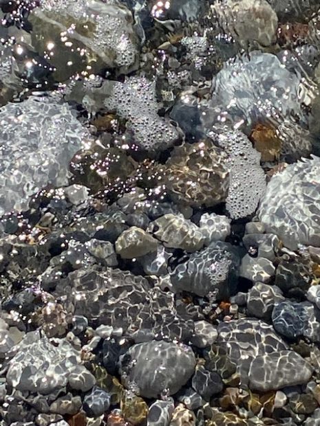 Gestern war ich wieder schwimmen und freute mich an dem Lichtspiel über den Steinen. Die Bewegung des Wassers wird hier durch einen ins Meer ragenden Felsen gebrochen, und so kommt es neben dem Felsen zu kleinen Strudeln und vielfältigen Überschneidungen zwischen dem heranflutenden und dem zurückflutenden Wasser. Diese Bewegung teilt sich dann in Lichtspielen den Steinen im Uferbereich mit.