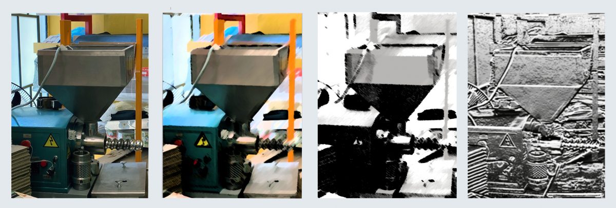 Eines der Fotos aber nehme ich zum Anlass, um die Verwandlung eines Foto-Dokuments in Bilder mit künstlerischem Anspruch zu zeigen. Als Mittel benutzte ich ein paar Filter von Fotoshop. Selbstverständlich ist das ein oberflächliches Vorgehen. Anspruchsvoller wäre es, das Foto tatsächlich in Gemälde, Kohlezeichnung, Gravour umzusetzen. Aber dazu fehlt mir die Zeit, und bei der Gravour auch das technische Können. Der moderne Mensch und Künstler hat es halt eilig und bedient sich gern vorgefertigter Formate.