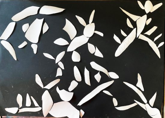 Die Ouvertüre bildete erneut das Bildlegen mit Maries Schnipseln – der zehnjährige D wollte das so. „Sollen wir andere Schnipsel nehmen?“ – „Nein, die“. Mich freute es, denn es ist schön, wenn sich Routinen ausbilden. Aber kleine Varianten sind dennoch angenehm. Daher trugen wir heute Hüte (schließlich üben wir fürs Theater) und rieten, welche Farbe sich beim Umdrehen zeigen würde. Meist rieten wir daneben, aber manchmal trafen wir es – und jubelten. Sicher werden wir das nächste Mal schon viel mehr Richtige haben, denn wir merkten uns spielerisch manche Form mitsamt der Farbe.