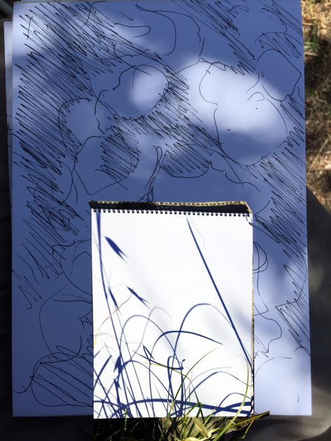 Das Foto zeigt ein Viereck, oder genauer: es IST ein Viereck, und darinnen abgebildet befindet sich ein weiteres Viereck: Das ist ein Blatt Papier, auf dem ich die Schatten zwischen den Sonnentalern nachgezeichnet habe. Darauf liegt nun das Viereck, für das die beiden anderen die Rahmung bilden: Ein kleinerer Zeichenblock fängt die Schatten der Gräser auf, die davor aus dem Boden sprießen. Sie sind lieblicher als es eine Zeichnung von Menschenhand vermöchte.