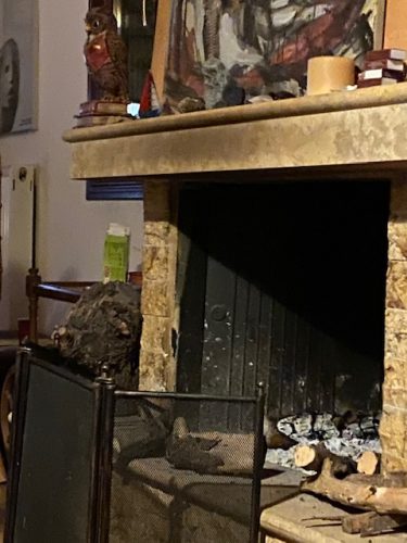 Dann wende ich mich dem Kamin zu, in dem ich ein Feuer entzündet habe, denn ohne Strom geht auch die Heizung nicht. Wir haben genug Schnittholz von den Oliven, die kann ich bedenkenlos verheizen. Und was gibt es Schöneres, als ein lustiges Kaminfeuer an einem düsteren Tag?