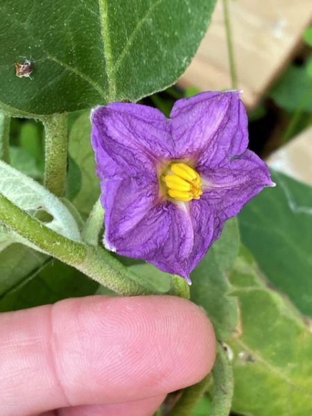 Es sind nur zwei, oder sage ich besser: es sind sogar zwei! denn erwartet habe ich nicht, dass das Pflänzchen die Hitze des Sommers und unsere Abwesenheiten überstehen würde. Es gibt sogar eine neue Blüte, die sich farblich als Aubergine zu erkennen gibt. (Wiki: Aubergine ist eine dunkelviolette oder bräunlich-violette Farbe, die der Farbe der Außenhaut europäischer Auberginen ähnelt. Die erste aufgezeichnete Verwendung von Auberginen als Farbname auf Englisch war 1915.) Ihr goldgelbes Innenleben inmitten der elegant faltigen hellvioletten Blütenkranzblätter sieht man nur, wenn man sie ein wenig anhebt. Denn gewöhnlich ist ihr Köpfchen verschämt gesenkt.