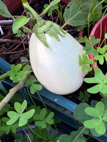 Eierfrucht heißt Aubergine in deutscher Übersetzung, eggplant in englischer. Sehr passend, befand ich, als ich heute unsere weißen Auberginen betrachtete. (Wiki: Die in Europa bekannteste Form ist Solanum melongena var. esculentum mit ihrer keulenförmigen, dunkelviolett bis schwarz erscheinenden, etwa 20 cm langen Frucht. Andere Formen können aber auch weiß (eierfarbig, daher der Name) oder auch weiß und violett sein)