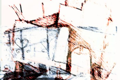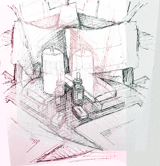 Anstatt Foto un Zeichnung, habe ich nun versucht, die Zeichnungen miteinander zu verschmelzen. Ich probierte hinund her, färbte die beiden Zeichnungen unterschiedlich ein, aber die dunkle Tischplatte war einfach zu dominant. Also schnitt ich sie weg.