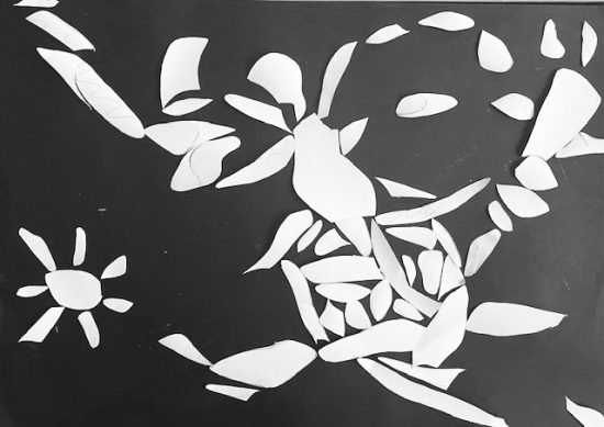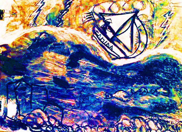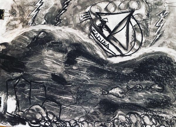 Inzwischen gewittert es draußen heftig. Die Blitze machen ihm etwas Angst, und wir stellen die Tür zu. D will jetzt noch eine Zeichnung machen und gibt einen Titel vor „Unwetter“. Diesmal schneidet er das Papier selbst zu, und wir verklammern es mit einer festen Unterlage. Wie schon zuvor liebt er besonders das Schwärzen. Ich setze Boot und Fisch hinein und gebe dem Bild dadurch einen „realistischen“ Anstrich.