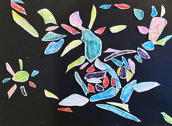 Unsere gemeinsame Zeichnung gefällt ihm sehr (und mir auch), und er stellt sie selbstbewusst auf die Staffelei, nachdem wir ihr noch einen Rahmen verpasst haben. Einen Titel gibt er nicht, findet aber, dass es sich um etwas Außerirdisches handele.
