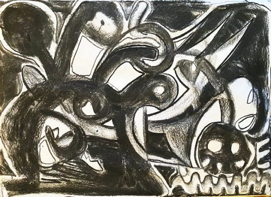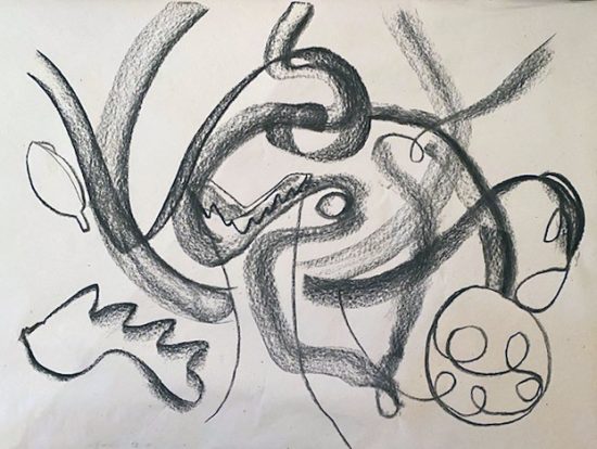 Ich zeige ihm auch, wie man mit einem Radierer ins Schwarze hineinzeichnen kann. Das Endprodukt – „Elpida“ = Hoffnung – findet er ganz gut, aber etwas „gewöhnlich“. Das Abstrakte sagt ihm mehr zu. Diese Neigung zum Abstrakten habe ich auch bei meinem 11-jährigen Besucher festgestellt.