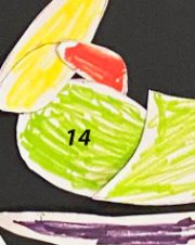 Grün ist auch das 14. Türchen, aber es ist nicht das solide Hintergrundgrün von Josephs Arm, sondern ein zärtliches Lindgrün, das das rosenknospenfarbige Köpfchen des Neugeborenen trägt.