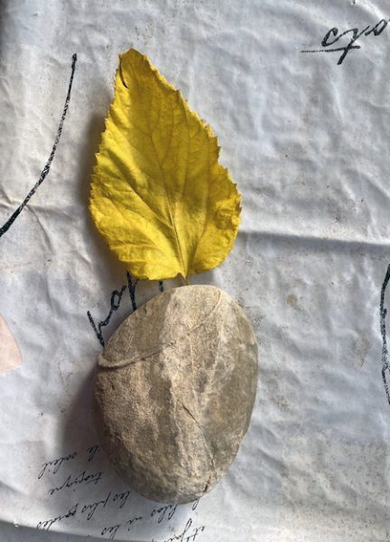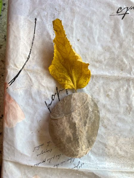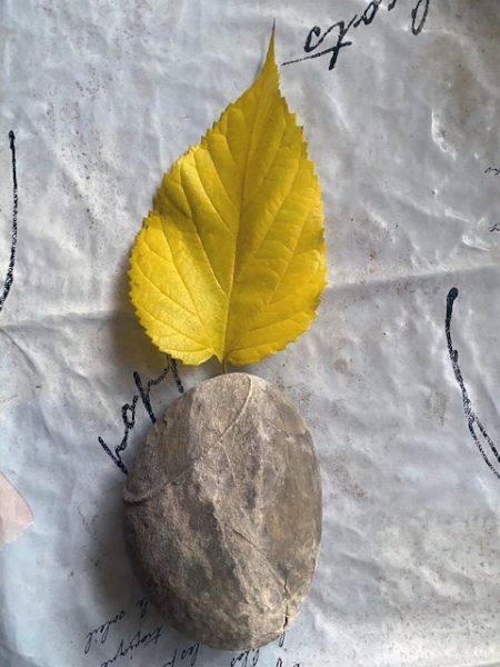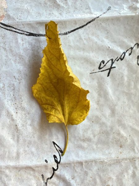 Welches Blatt? Nun, dieses goldgelbe Blatt, das ich, um es beim Verwelken zu beobachten, mit einem Stein beschwert und festgelegt hatte.