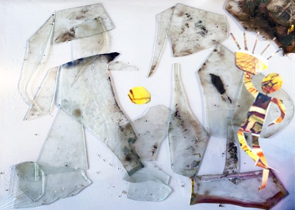 Wenn man so reich beschenkt wird, möchte man gern ein wenig zurückgeben. Womit aber kann ich die kleine Dora beglücken? Vielleicht mit einem Legebild aus Scherben? Hier sieht man sie, wie sie zwei traurige Gestalten mit einem goldenen Ball beschenkt hat. Die eine bolzt gleich los, die andere schaut bedenklich. Vielleicht haben sie keine Ahnung, wozu der goldene Ball dient?