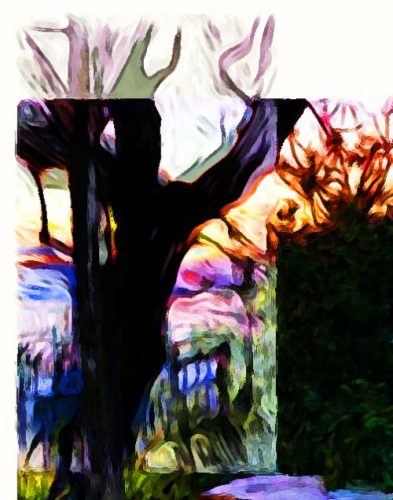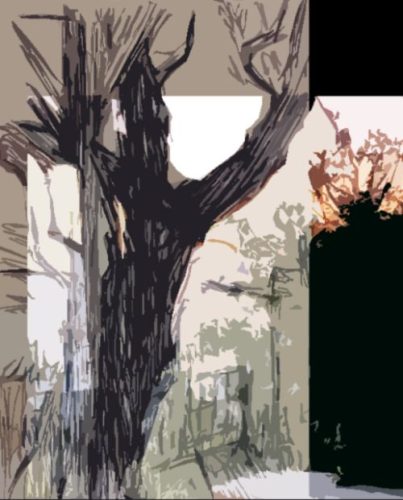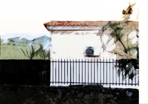 Sitzend unter dem Vordach eines alten Kirchleins schaute ich ins Land. Der Stamm eines Olivenbaums verschmolz fast mit dem hölzernen Pfosten des Vordachs. Zur anderen Seite hin verstellte mir ein alleinstehendes Wohnhaus die Sicht. Keine besonderen Motive, doch genug für drei Skizzen im winzigen Reporterblock; Baumstamm – Haus – Astgabel. Dann fotografierte ich die Motive. Zu Hause würde ich Foto und Skizze miteinander überblenden und vielleicht ein wenig bearbeiten.