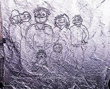 Vorhin habe ich eine Kritzelei in eins von Myriades Fotos (Impulswerkstatt) eingebaut. Das Original ist eine großformatige Kohlezeichnung auf Papier von der Rolle. Von der Zeichnung gibt es zwei Versionen. Die habe ich dann mit diversen Filtern bearbeitet, um den Eindruck zu erwecken, dass es sich um einen metallischen, angerosteten Untergrund handelt, in den jemand eine Szene geritzt hat.
