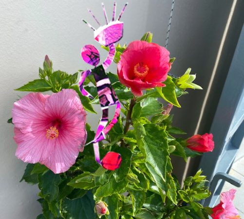 Dora präsentiert die Hibiskusblüten vor dem Kramladen