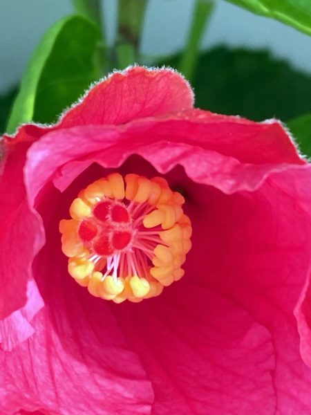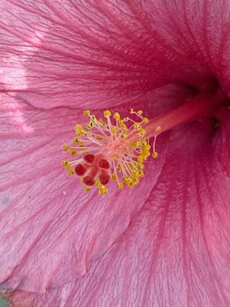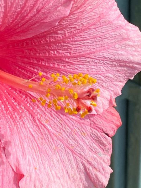 das Rot einer Hibiskusblüte, die sich vor dem Kramladen öffnet …