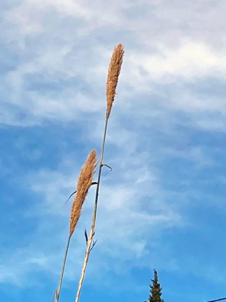 die stachelbewehrten Äste eines mimosenartigen Busches und die Schilfpinsel im leichten Wind …