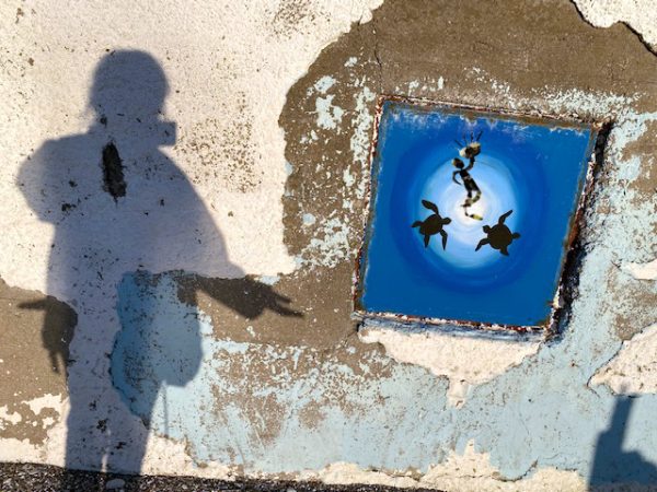 Dora gefällt es spazierenzugehen. Sie ist dann immer bereit zu kleinen Späßen, um mich aufzuheitern. Hier präsentiert sie ihre Künste auf einem Schattenbogen, den eine Absperrung am Bürgersteig gegen eine weiße Hauswand wirft.