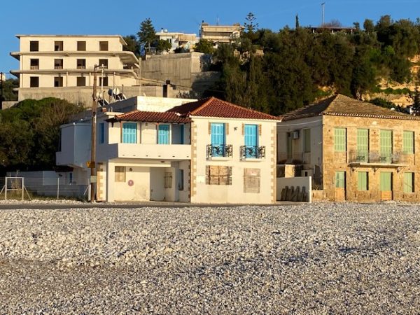 In Akrogiali wanderten, standen und saßen außer mir noch andere einsame Gestalten herum, Auch eine Familie sah ich: glücklich schleppte der kleine Sohn ein großes Stück Schwemmholz ab, die Mama schleppte ein noch größeres. „Glück auf“ wünschte ich, als seien sie Grubenarbeiter, und setzte mich auf die Mole, um zu zeichnen. Vor mir lag die Häuserzeile des Dorfes im Sonnenglanz.
