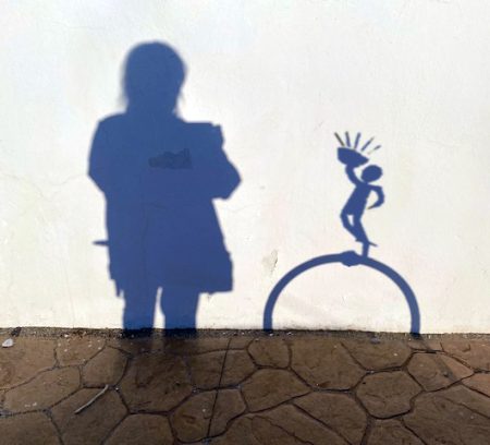Dora gefällt es spazierenzugehen. Sie ist dann immer bereit zu kleinen Späßen, um mich aufzuheitern. Hier präsentiert sie ihre Künste auf einem Schattenbogen, den eine Absperrung am Bürgersteig gegen eine weiße Hauswand wirft.