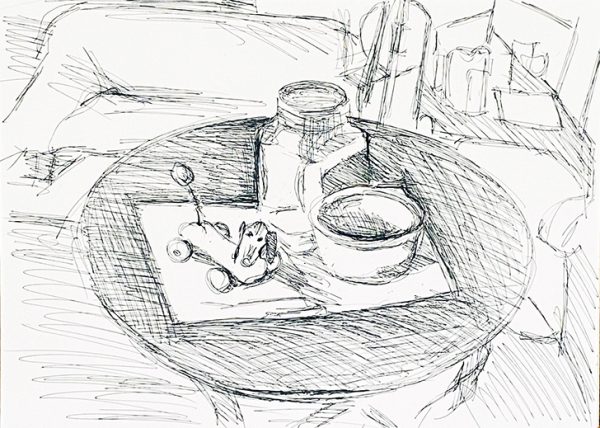 Im Atelier gibt es eine runden schwarzen Eisentisch, darauf finden sich immer irgendwelche Dinge an. Heute war es ein Glas mit Schraubverschluss, eine Joghurt-Keramikschale und ein Wackelhund. Und darunter eine Zeichnung, die ich zuvor gemacht hatte.