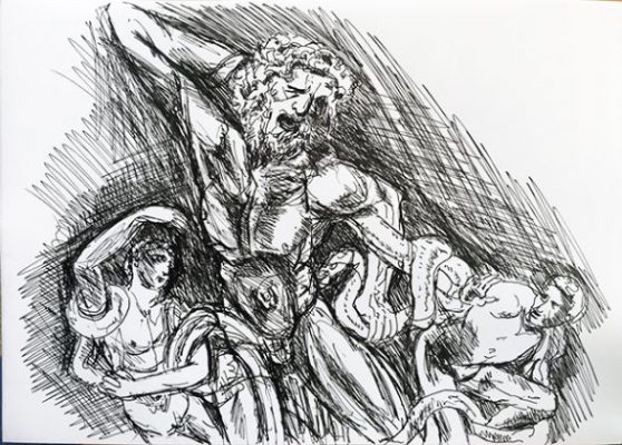 Die Laokoon-Gruppe illustrierte einen Eintrag vom März 2020 https://gerdakazakou.com/2020/03/25/laokoon-in-corona-zeiten-taegliche-zeichnung/ Dort erkläre ich den Mythos und vermerke: „Ich fand, dass sie ganz gut das gegenwärtige Lebensgefühl abbildet: ein langsames Ersticken durch „Schlangen“, deren Herkunft ungeklärt ist.“