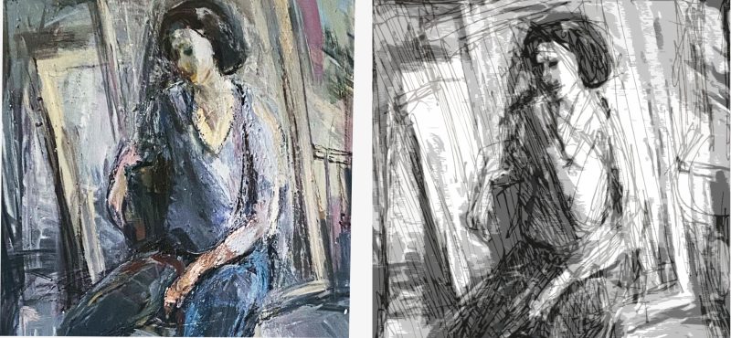 Im Atelier sitzend, fällt mein Blick auf eine junge Frau, vor Jahren flüchtig gemalt, die mich auffordert: „Zeichne mich“. Soll ich etwa mein eigenes Gemälde abzeichnen? Umgekehrt würde ein Schuh draus: erst zeichnen, dann malen. So macht man das von altersher.