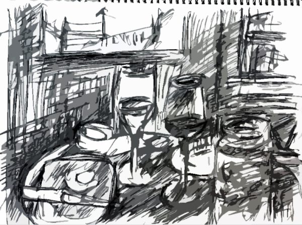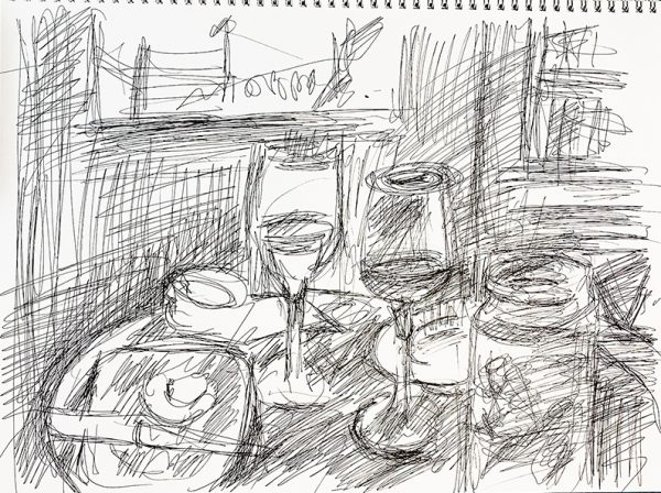 Das TV-Gerät mit seinen schnell wechselnden Bildern versetzt das Interieur unserer Wohnstube in ein elektrisches Flackerlicht. Ich versuche, nicht auf den Bildschirm, sondern auf den Tisch davor zu schauen und die mal schemenhaften, mal hell ausgeleuchteten, dann wieder ins Dunkel getauchten Gläser, Teller und sonstigen Überbleibsel unseres Abendessens zu zeichnen. Mein Zeichenblock ist ebenfalls in dieses unruhige Licht getaucht.