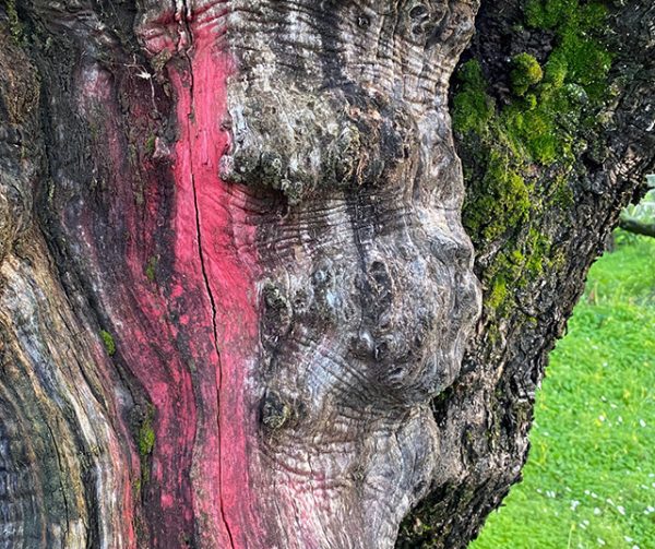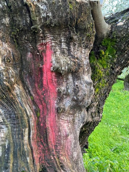 Vor ein paar Tagen kam ich an einem Olivenbaum vorbei, der eine rote Markierung trug. Das Blutrot kontrastierte stark mit dem Dnkelgrün der moosig überwachsenen Schattenseite des Stamms und dem leuchtenden Grün der Kleewiese darunter.