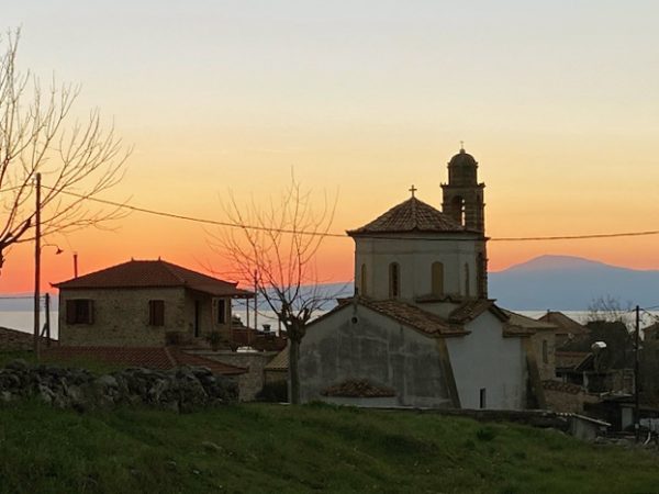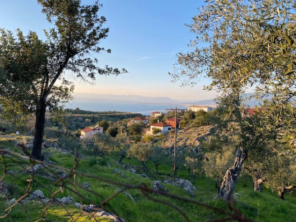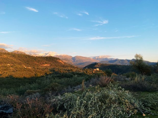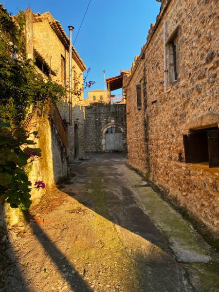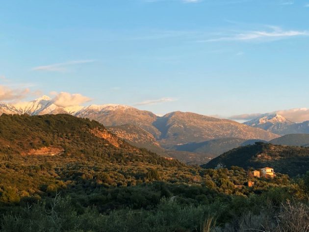 Gestern machte ich einen großen Spaziergang – oder sind 7.6 km etwa doch schon eine Wanderung? Wie dem auch sei. Ich spazierte die Straße bis zum nächstgelegenen Bergdorf namens Megali Mantinia hinauf und, anstatt auf anderem Weg zurückzukehren, ging ich geradeaus weiter. Immer weiter: durch das stille steinerne Dorf, hinaus und hinauf vorbei an einer wild-unfruchtbaren Steinwelt, abgelegenen Ziegenkrals, bellenden Hunden hinter provisorischen Zäunen, einem Kirchlein, dessen großer Oliven bestandener Hinterhof mich zur ersten Rast lud. Hier und da ein Haus, auch zwei landwirtschaftliche Autos begegneten mir, wir grüßten uns, wie man es auf dem Lande tut. Dann tat sich die große Gebirgslandschaft auf, bis hinauf zu den Schneepipfeln des Taygetos blickte ich, und bis hinab zu den Buchten von Kalamata und Kardamili. Wäre die Sonne nicht untergegangen und hätten die alten Knochen nicht protestiert, ich wäre immer noch dort unterwegs, in dieser großen weiten schweigenden Welt der Hirten und Berge.