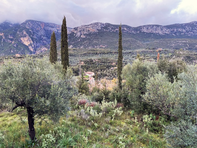 Dann gingen wir zu Dritt (oder, mit Dora, zu viert) spazieren, durchs Dorf und drüber hinaus. Der Starkregen der Nacht und des Vormittags hatte die Pfade zum Teil in Bäche verwandelt. Um das Vorgebirge des Taygetos trieben weiße Wolkenschleier. Die Ebene in fahlgrünem Olivengrau, hier und da ein Haus, eine Kirche. Am Wegrand zwischen mächtigen Wolfsmilchgewächsen ein paar zerzauste wilde Iris und eine rote Anemone. Eine Schafherde – der Hütehund wich scheu vor uns zurück, der Hirte erklärte uns den Weg.