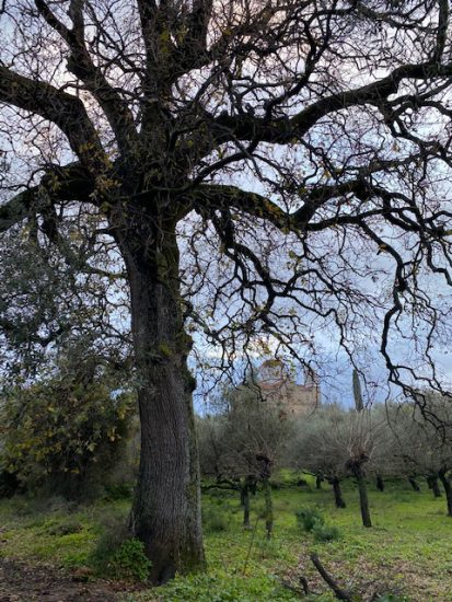 Eine mächtige Platane und die Hauptkirche des Dorfes im Hintergrund.