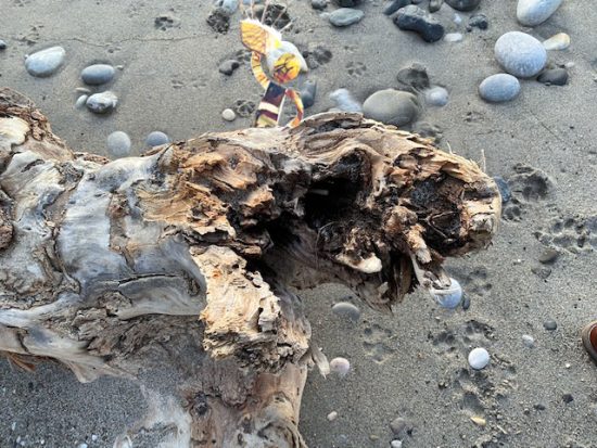 „Ich hab eins für dich! Guck mal!“ schreit Dora. Und tatsächlich sehe ich, wie die kleine Dora ein prächtiges Wurzelwesen, das allein am Strand liegt, hochstemmt. Dankbar nehme ich ihr Geschenk entgegen. Vielleicht werde ich es nachher zeichnen.