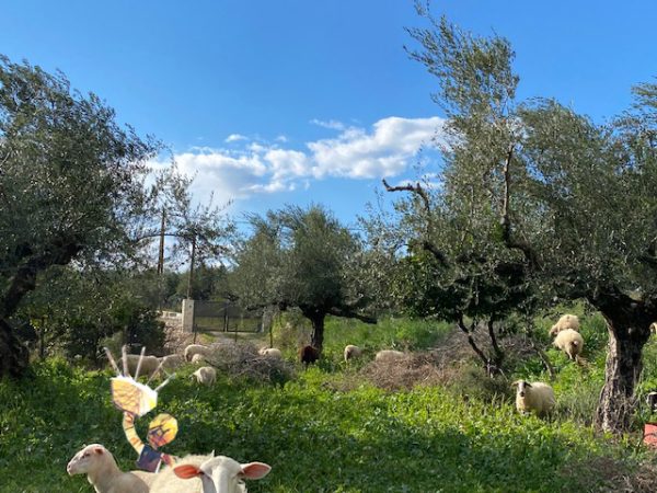 Jetzt also rennt der Große Schwarze zum Müllplatz. Der Braune ist schon dort. Und wir können endlich ein bisschen mit den Schafen plaudern, ohne dass uns die Hunde stören. Die Schafe kommen auch gleich näher. Sie sind interessiert an Neuigkeiten, nicht so stark wie Ziegen, aber ganz uninteressiert sind sie auch nicht. Dora setzt über den Zaun und schließt gleich Freundschaft mit einer großen imposanten Schäfin und ihrer halbwüchsigen Tochter.