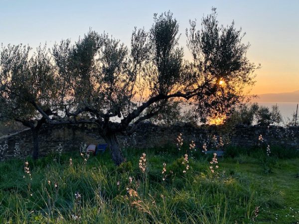 … zumal wenn der Boden eine Trockenwiese ist, auf der ein Sternenmeer blüht. Es sind Asphodelen, höher und prächtiger als ich sie sonst gesehen habe, und vom Abendlicht durchglüht.