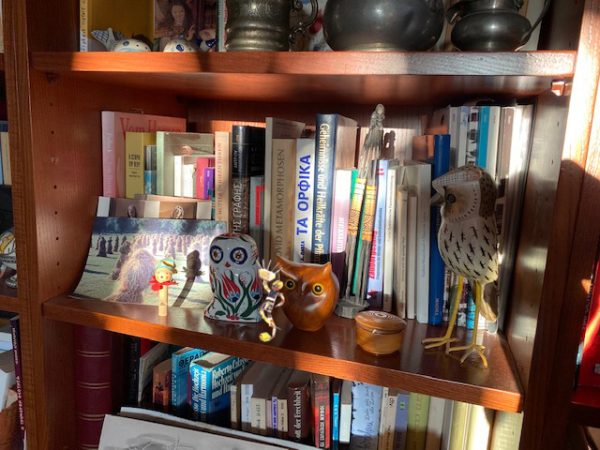 die Eulen, ach, Dora, es sind so viele, wie soll ich noch wissen, woher jede einzelne stammt? Wer sie mitgebracht hat?  Die beiden langen hölzernen Kerle, die an den Büchern lehnen, die kommen aus Afrika, aus Zimbabwe, die hat …“
