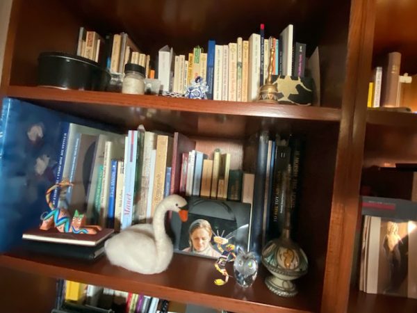 Am meisten aber interessiert sie sich für die Regalwand in meinem Zimmer. „Was ist dies? Wer ist das?“ verlangt sie zu wissen. Und da stehe ich nun und versuche mich zu besinnen.