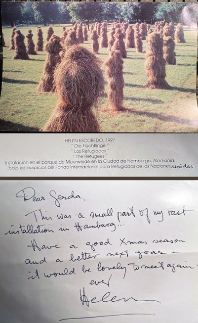 Aber nun hat Dora das Pfeifenköpfchen und deren tollen Schatten entdeckt. Den Schatten muss sie gleich selbst ausprobieren. Die Strohpuppen auf dem Foto dahinter interessieren sie nicht. Ich aber erinnere mich: Ja, das waren Flüchtlinge, die Helen Escobedo, meine mexikanische Freundin, vor vielen Jahren (1997) in Hamburgs Park Moorweide installierte. Wind und Wetter zerstörten sie, es blieben nur die Kreuze und ein paar Fetzen. Aber eines Tages, als Helen sie wieder einmal besuchte, um ihren Zustand zu dokumentieren, sah sie, dass junge Menschen diese armseligen Kreuze mit bunten Bändern und Blumen geschmückt hatten und um sie herum einen Feentanz aufführten. Das machte sie froh.