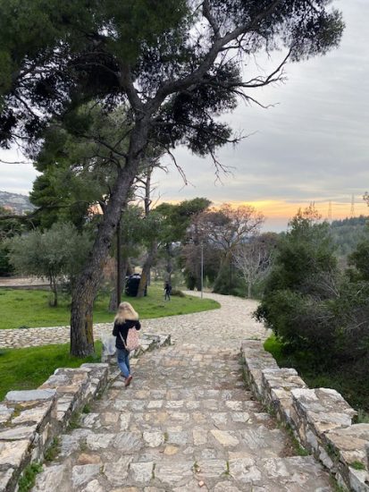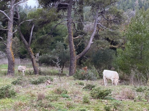 Es handelt sich um ein ausgedehntes parkähnliches Gelände mit Wäldchen und Sümpfen, das sich hinter dem altehrwürdigen Kloster Pendeli erstreckt und  eben diesem gehört.  Die Pforte ist immer offen, der Zugang frei. Ich war begeistert, und noch begeisteter war ich, als ich in einem Pinienwäldchen zwei grasenden weiße Rinder erblickte.