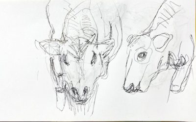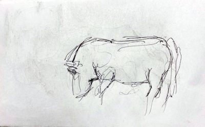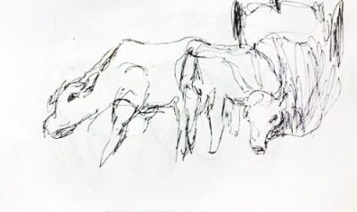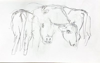 Die geruhsam grasende Kuh lud zu genauem Zeichnen ein – aber kaum hatte man die erste Linie einigermaßen gefunden, wendete sie den Kopf, drehte den schweren Leib, hob einen Fuß und wanderte weiter. Also musste man von vorn beginnen. Ich füllte sechs Blätter des winzigen Reporterblocks.