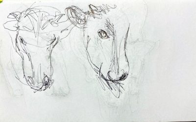 Vielleicht, dachte ich, sollte ich die Kuh doch mal anhand von Fotos studieren – und  machte eine Menge Fotos von der Schönen. Hier nur drei Überblendungen mit Zeichnungen.