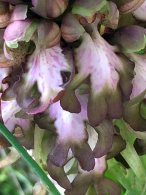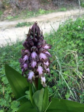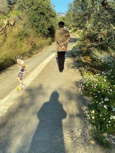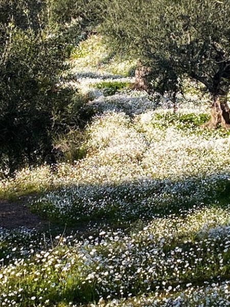 Ein weiter Spaziergang bringt uns im kühlen hellen Vorfrühlingslicht über das Bergdorf hinauf und hinaus. Weiß leuchtet der Berg, den in der Nacht Neuschnee bedeckte, weiß leuchten auch die Wiesen der kleinen Margeriten unter den alten Ölbäumen. Dazwischen immer wieder rote Einsprengsel der Anemonen, zarte Blüten der blauen Iris und allerlei rosa und hellviolette Blütenpolster. Auch die wilde „Hyazinthe, die eine Orchidee ist“, begegnet uns, sogar gleich an mehreren Stellen.