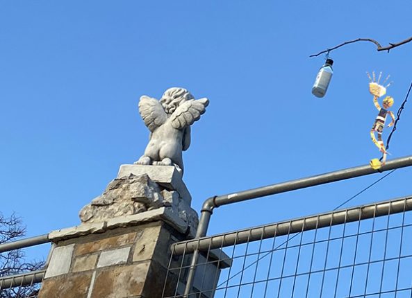 und schmunzeln über die ausgesucht kitschigen Verzierungen an einem aus vielen Teilen zusammengesetzten Haus. Dora hüpft auf den Zaun und schreit: „Ein Engel! Wer hat ihm seine Flasche weggenommen? Ich bring sie ihm grad mal!“