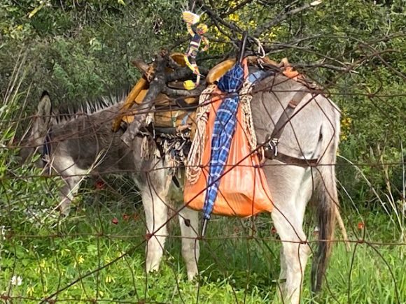 Wieder führte uns unser Weg über das Bergdorf hinaus. Wandernd sprachen wir über dies und das: über Weltentwicklung, Erwartungen, Zukunftspläne, zumal dies der letzte Tag meines lieben Besuchers hier ist. Unsere Unterhhaltung wurde unterbrochen durch einen prächtigen Esel, der im Gebüsch neben der Landstraße graste. In einem Seitenbeutel steckten mehrere Laibe Brot, darüber hing ein Regenschirm. Seine Besitzerin war durch das Gebüsch verborgen.